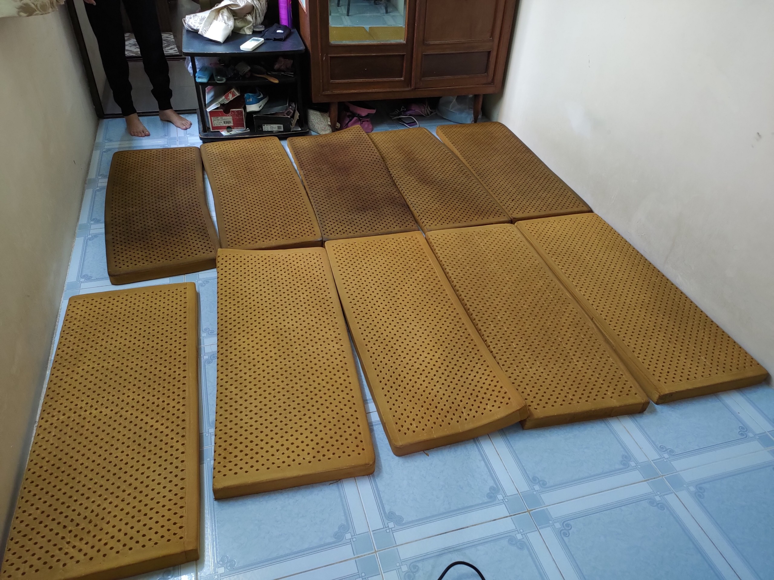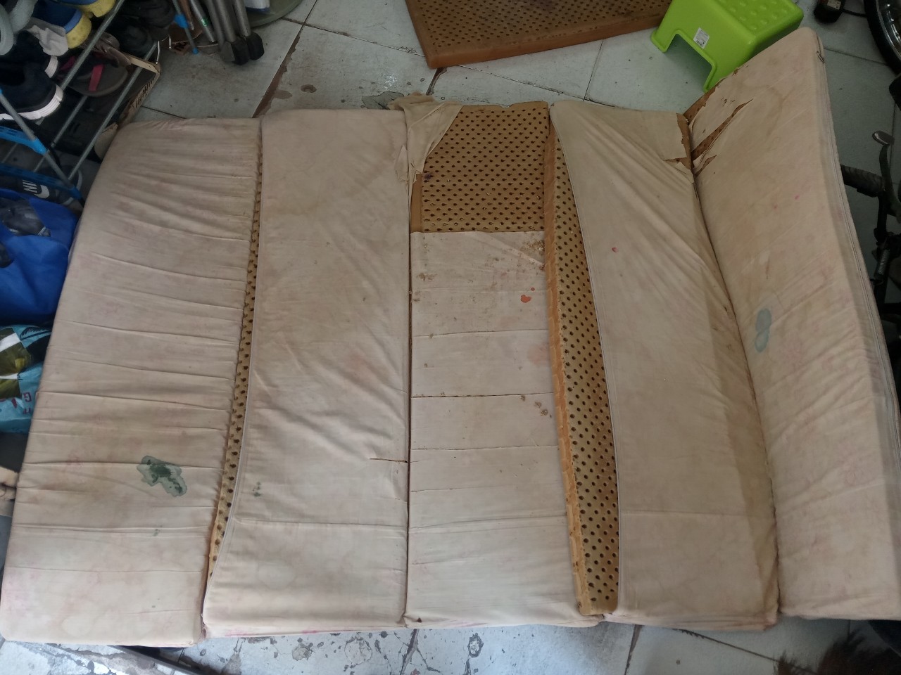 Bước 1: Tháo lần lượt từng ruột nệm ra khỏi vỏ nệm ( 5 tấm) ra khỏi ruột nệm đem giặt